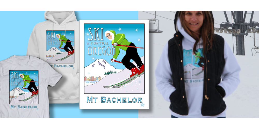 Ski Mt. Bachelor - by Miles. Mt. Bachelor ski poster, ski poster T's and ski poster Hoodies. Posters in 2 sizes. T's and Hoodies in white and Adult sizes Sm, Med, Lg, and X-Lg. Vintage image of skier on Mt. Bachelor in Bend, Oregon. Part of the Miles High Desert Collection.
